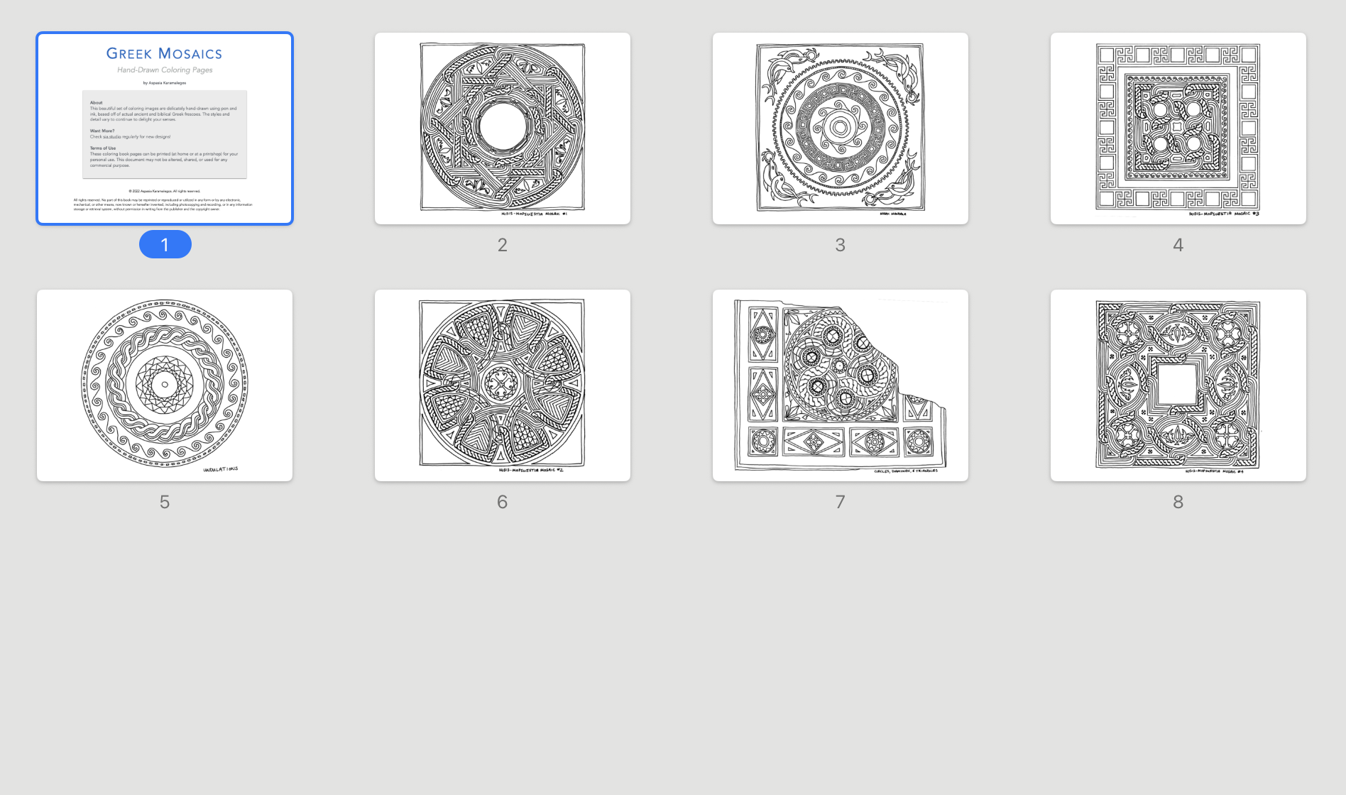 Inspired by classical Greek mosaic patterns and biblical artistry, this curated collection features seven intricately hand-drawn designs rendered in pen and ink. Each composition showcases distinct stylistic elements and varying levels of detail, offering a sophisticated meditative experience for coloring enthusiasts and watercolor artists alike.