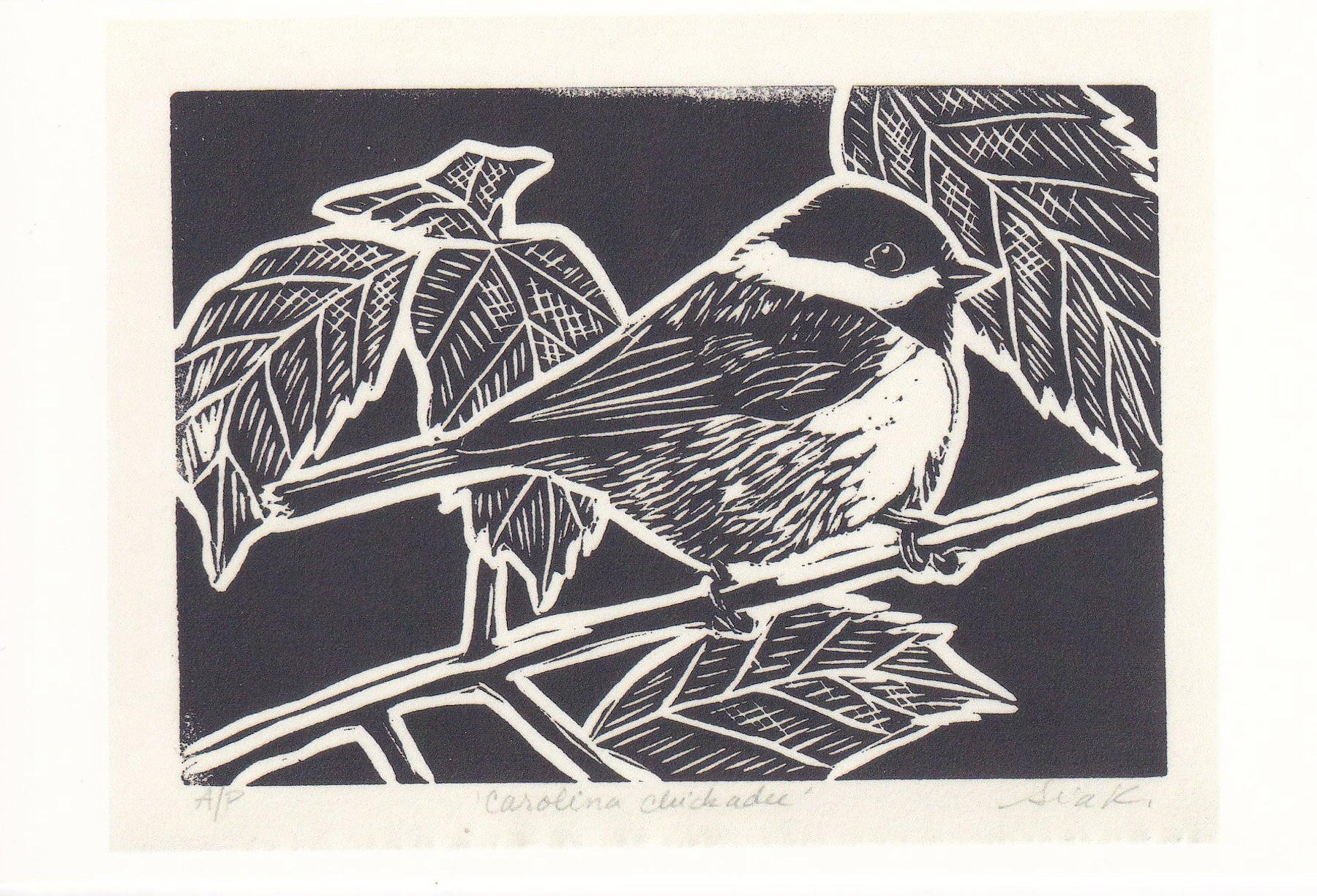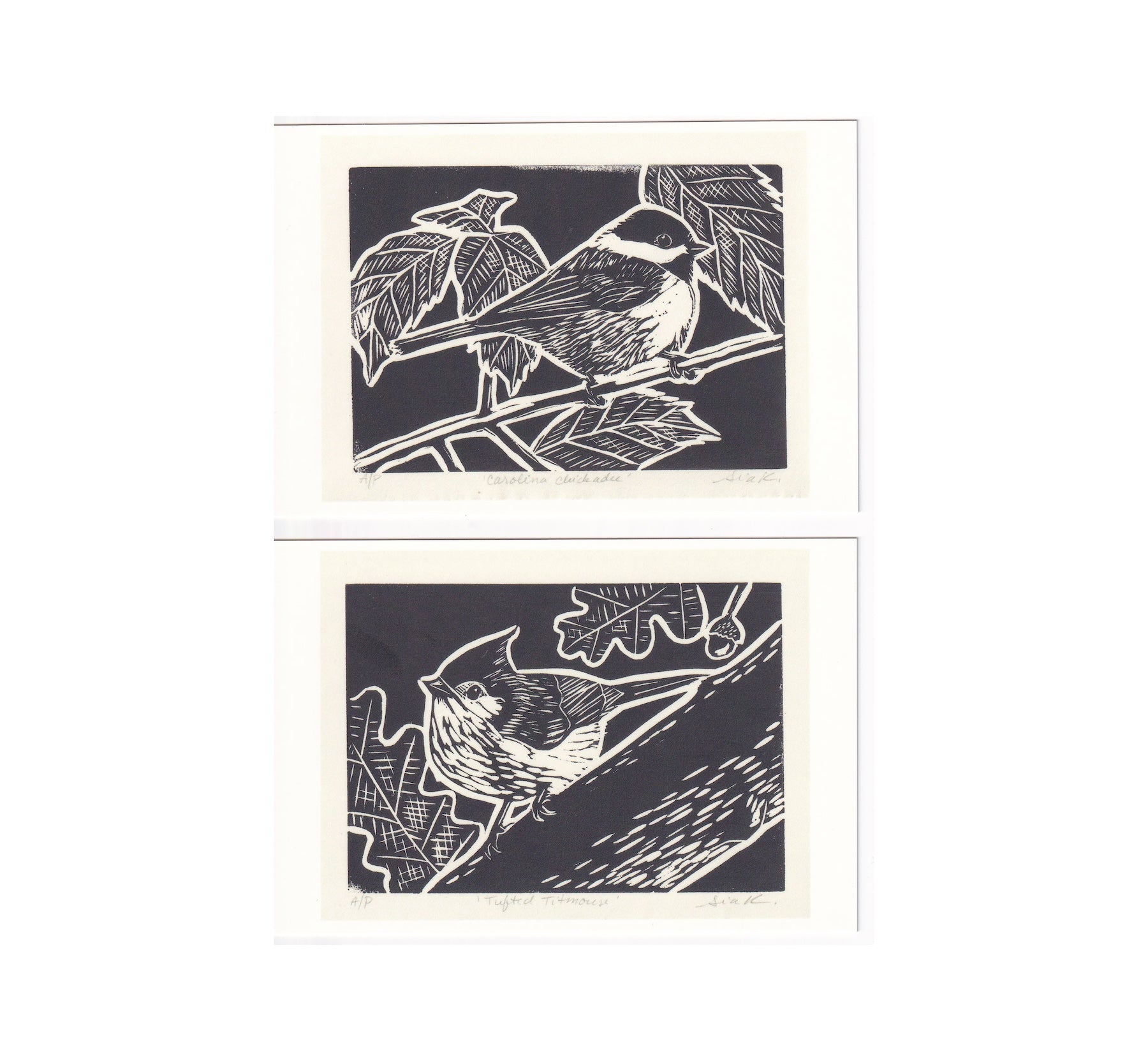 Celebrate the charm of hand-carved printmaking with this 4x6 postcard series. Each card features a high-quality reproduction of my original songbird linocuts—Carolina chickadees and tufted titmice rendered in bold black ink. The crisp carved lines and rich textures preserve the warmth and character of traditional block printing.